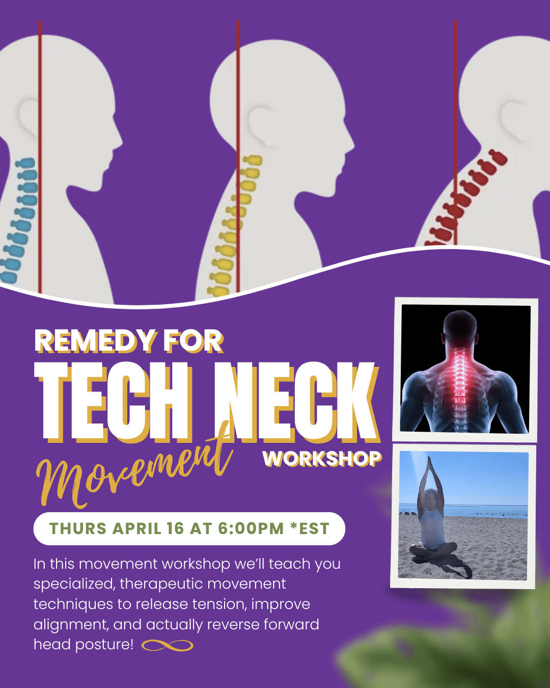 TECH NECK REMEDY Movement workshop is designed to help you create more space, ease, and mobility in & around your neck, shoulders and upper back.